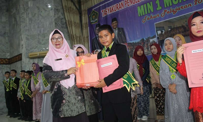 Kepala Madrasah Ibtidaiyah Negeri I Muara Enim Sumini memberikan reward dan piagam penghargaan kepada peserta didik kelas VI yang telah menyelesaikan hapalannya.