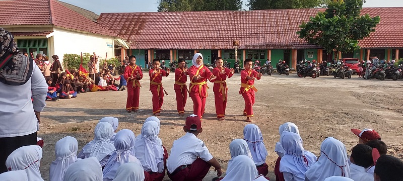 Siswa baru menyaksikan penampilan kegiatan ekstrakulikuler yang ada di Madrasah Ibtidaiyah Negeri I Muara Enim yakni penampilan rumah tahfiz madrasah, tapak suci, pramuka, senam dan polisi cilik madrasah.