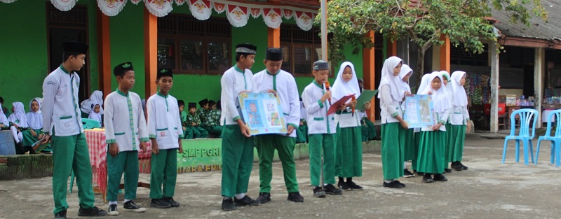 Siswa dan siswi kelas VI.a Madrasah Ibtidaiyah Negeri I Muara Enim menampilkan seni drama dengan judul “Stop Bullying” pada acara muhadharah bertempat di lapangan madrasah, Jumat (03/02).
