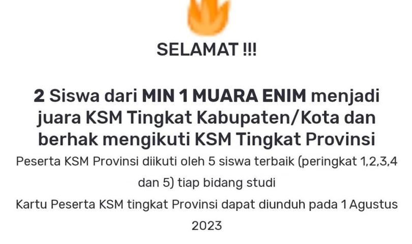 siswa Madrasah Ibtidaiyah Negeri I Muara Enim berhasil lolos melaju ke Tingkat Propinsi Sumatera Selatan setelah mengikuti Kompetisi Sains Madrasah (KSM) di Tingkat Kabupaten Muara Enim yang dilaksanakan pada tanggal (10/07) yang lalu, Jumat (14/07).