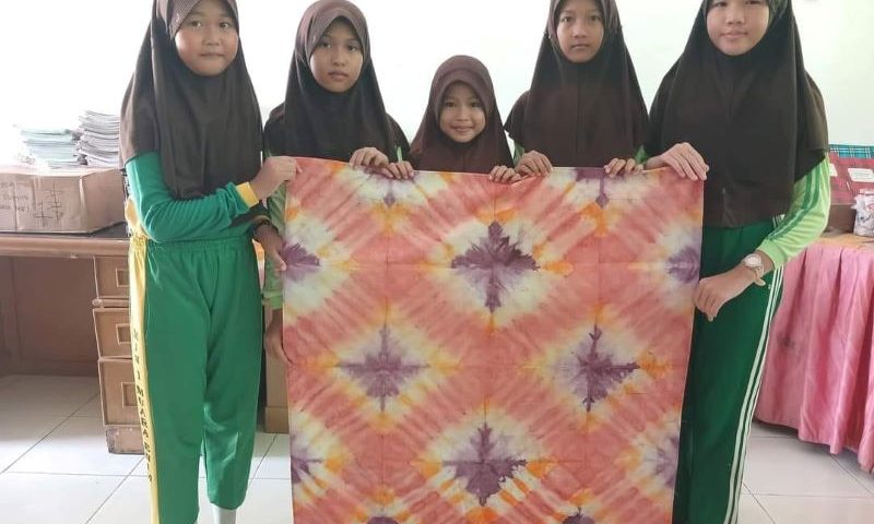 Siswa kelas IV. C Madrasah Ibtidaiyah Negeri I Muara Enim membuat kerajinan batik sederhana dengan teknik ikat celup, siswa dibagi menjadi beberapa kelompok, setiap kelompok terdiri dari 5 orang siswa, Jumat (10/05).