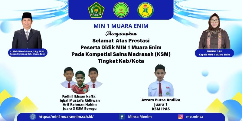 Siswa Madrasah Ibtidaiyah Negeri I Muara Enim meraih Juara I Kompetisi Sains Madrasah (KSM) IPAS Terintegrasi atas nama Azzam Putra Andika dan Juara III KSM Beregu Sosial Sains Terpadu ( Matematika dan IPAS) atas nama Arif Rahman Hakim, Fadhil Ikhsan Kaffa dan Iqbal Mustafa Ridhwan pada Tingkat Kab. Muara Enim yang telah dilaksanakan pada tanggal (01 s.d 03/07) bertempat di MIN I Muara Enim Sabtu (06/07).