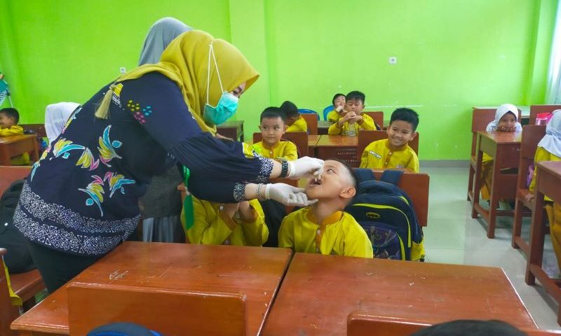 Siswa Madrasah Ibtidaiyah Negeri I Muara Enim kelas 1, 2 dan kelas 3 yang berusia 7 tahun 11 bulan menerima imunisasi polio. Imunisasi polio sangat penting diberikan kepada anak- anak sebelum anak tersebut berusia 8 tahun, Jumat (26/07).
